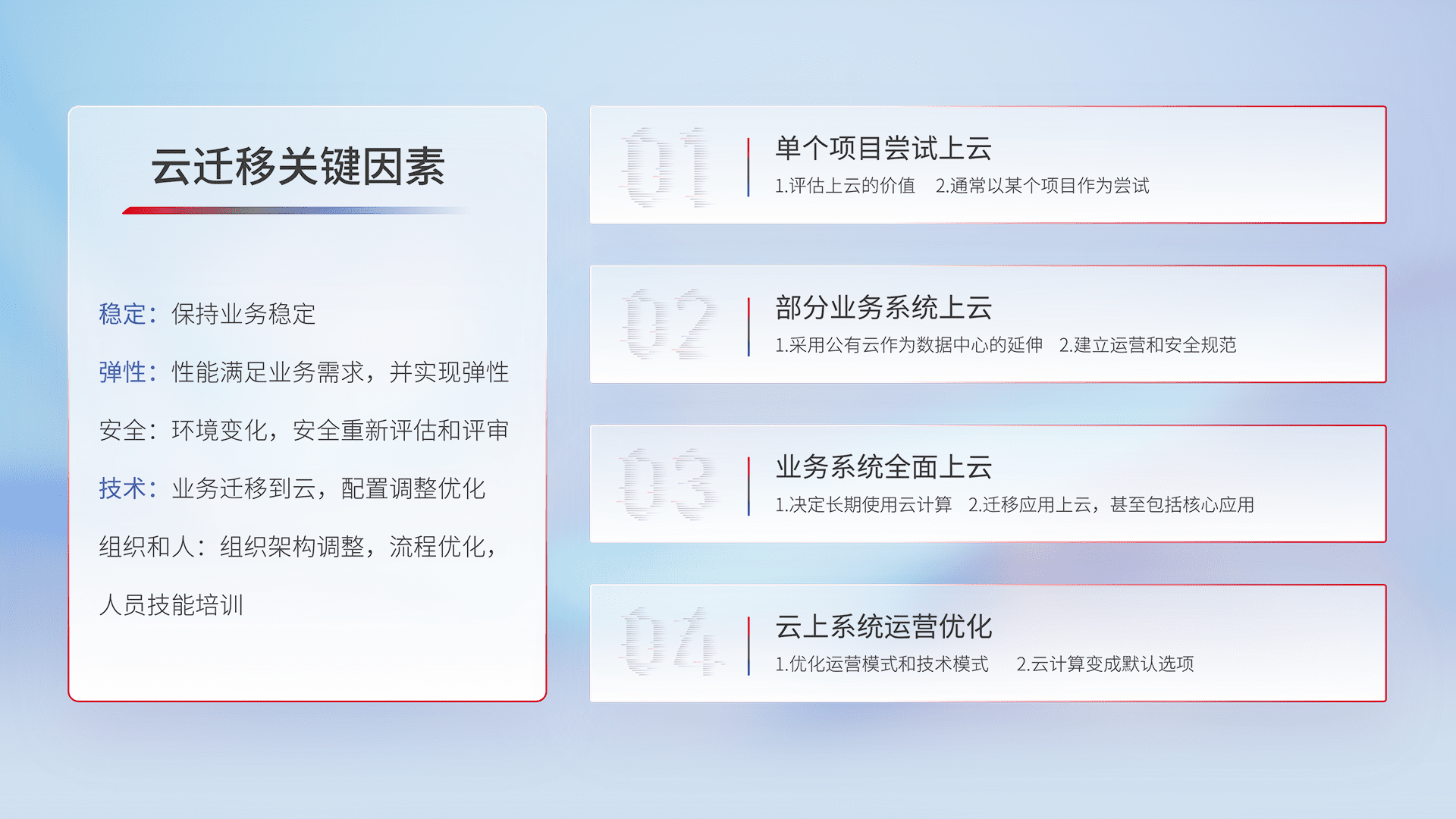 结合实际业务,,,从规划设计、、、、云平台选型、、云原生改造、、数据迁移、、、、集成交付,,迁移全过程为客户识别最佳上云路径,,,,做好风险识别管理,,,,设计网络架构、、、、身份权限、、安全审计合规、、、、操作审计、、、、日志审计、、监控告警策略、、多站点容灾设计等,,,,对云上基础设施进行整体规划,,,,提升IT治理水平,,,,以满足弹性、、高可用、、、高性能的需求。。。