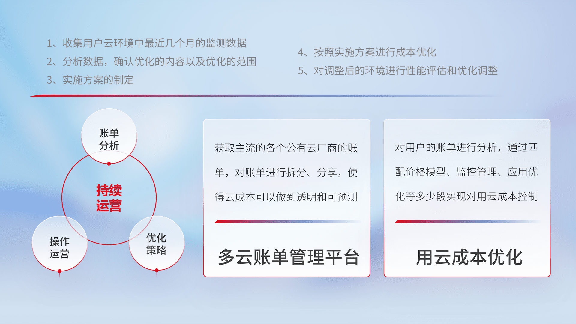通过多云纳管,,,以统一的资源数据模型把客户的云资源进行抽象和封装,,,,进而实现对多云资源的统一操作,,保障云资源管理的可靠性、、、稳定性与可用性。。。。量身定制化运维内容,,配置、、、、开发运维、、、、补丁管理、、备份、、、、监控、、认证和访问管理、、、审计和日常巡检等,,,,保障在用云过程中的可靠度,,稳定度以及高可用率。。。
