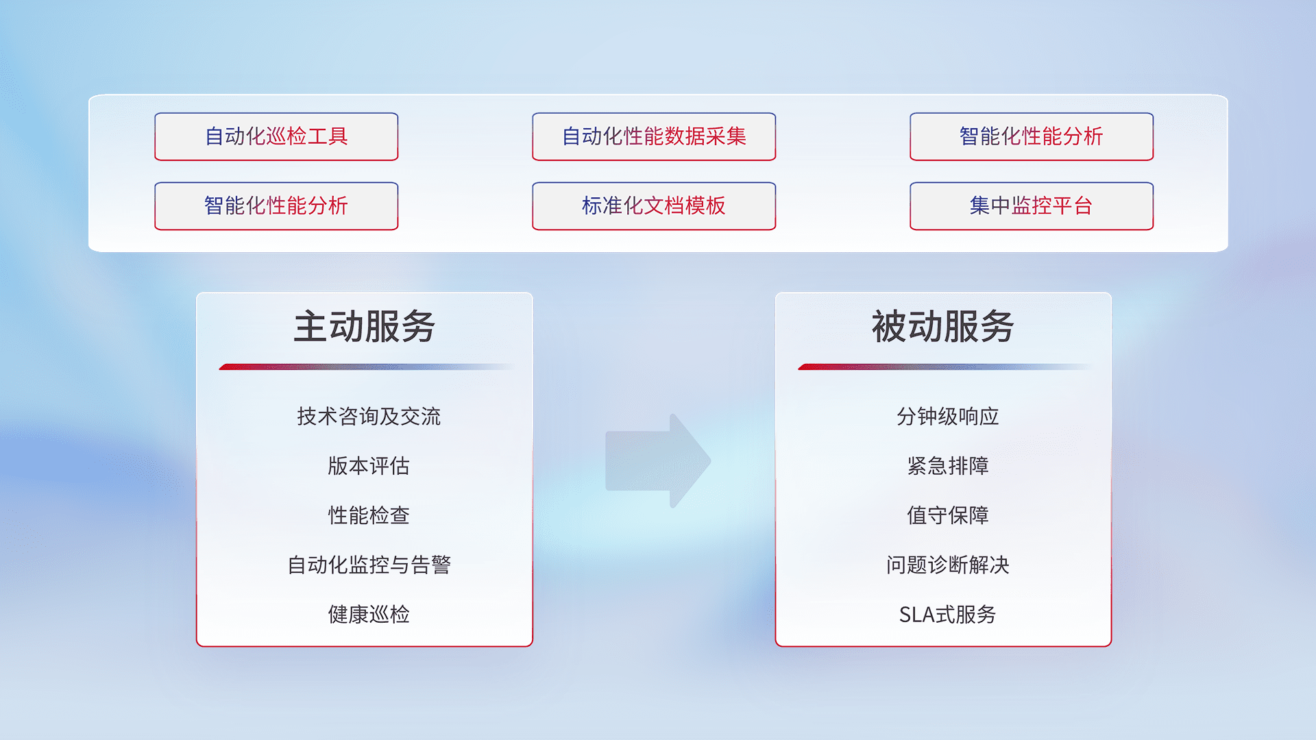 智能化工具和标准化文档,,保障服务质量,,,提供主动服务(包含技术咨询、、、版本评估、、、、性能检查、、、、自动化监控与告警、、健康巡检)和被动服务包含(分钟级响应、、紧急排障、、值守保障、、、、问题诊断解决、、、SLA服务)。。
